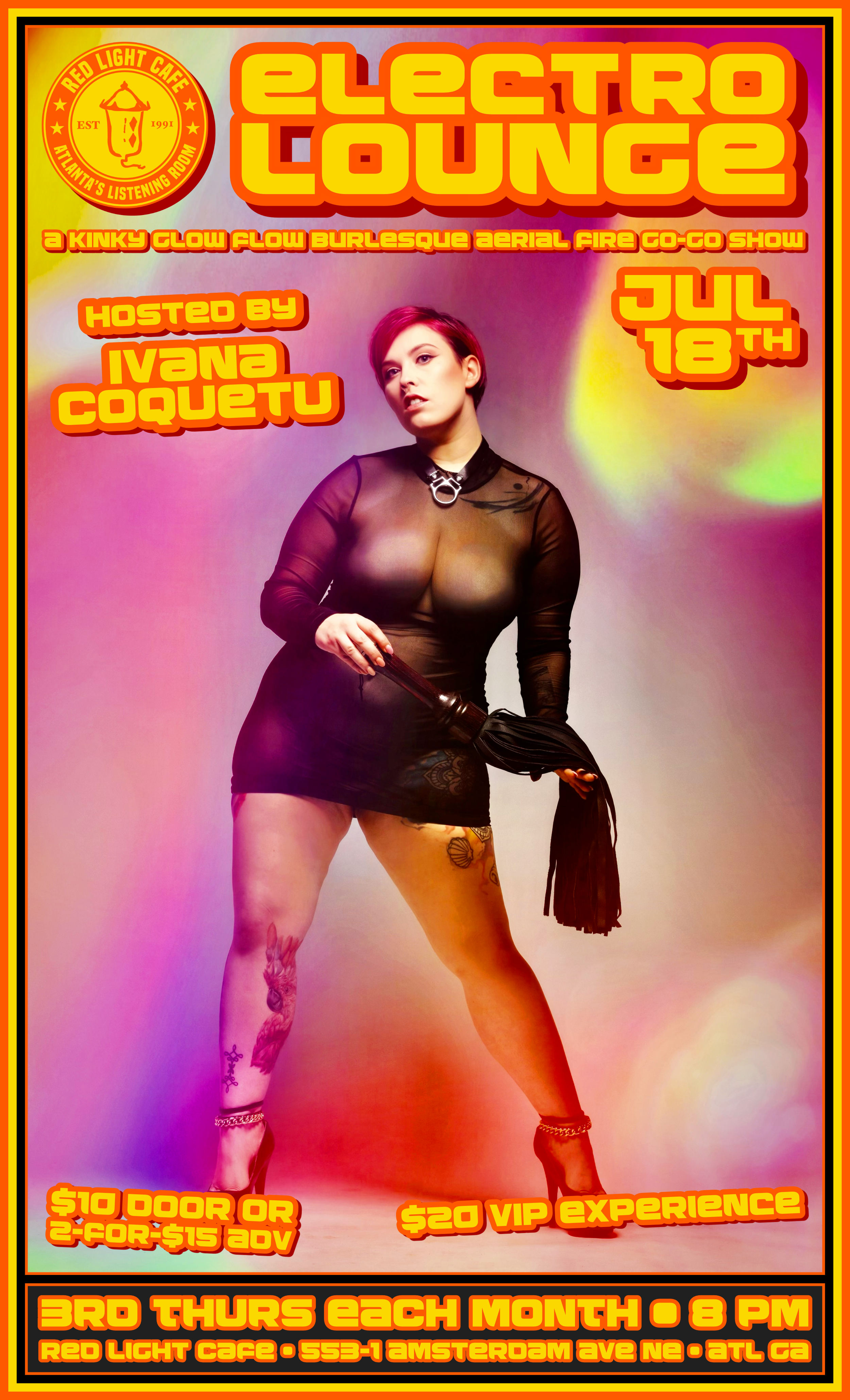 Electro Lounge is a safe space to let your authentic self come out, or hide out. All weirdos are welcomed and celebrated! You may end up on stage to spin The Wheel of Kink and getting #Spanked by the Mistress of the Mic: Ivana Coquetu. Or you may just have a drink and watch the show before joining in on the games and dance and flow.